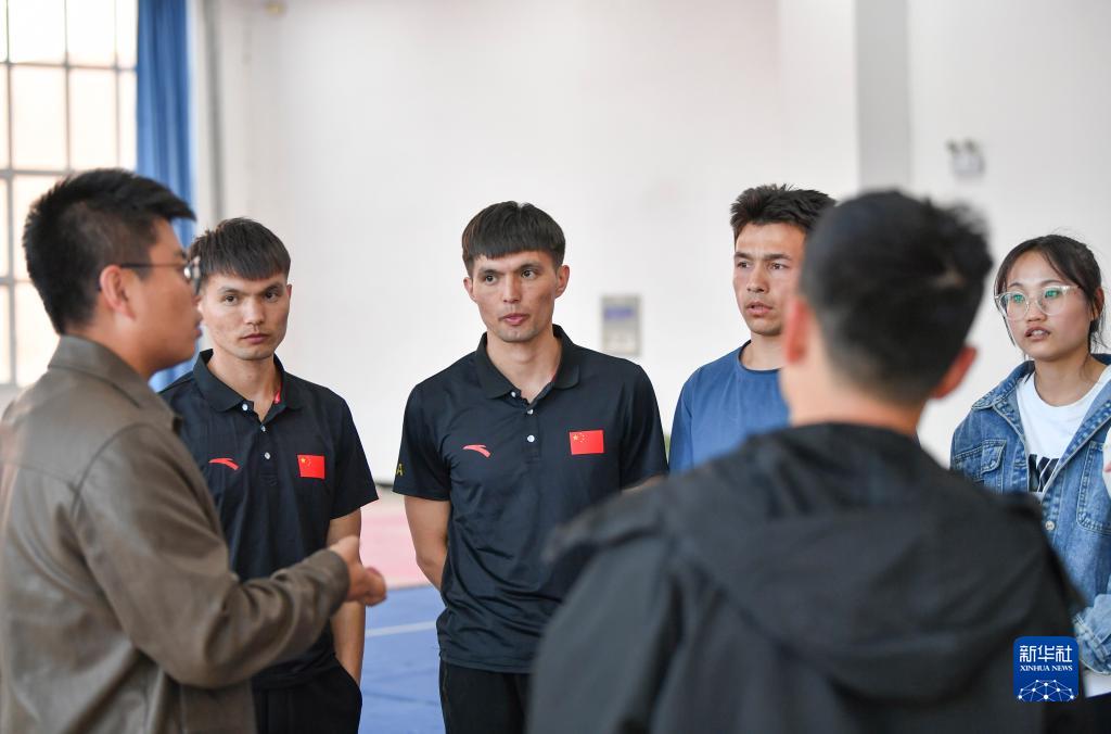 哥哥阿布都拉·巴吐尔江(左三)、弟弟阿布都热合曼·巴吐尔江(左二)和同学艾散·玉苏普艾麦提(右三)、成云芳(右一)在新疆昌吉学院训练馆内一起听武术老师袁军讲解训练要点(4月19日摄)。新华社记者 胡虎虎 摄