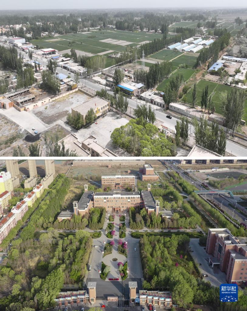 拼版照片上图为新疆阿克陶县皮拉勒乡喀拉苏村,“阿布都兄弟”在这里出生长大(无人机照片,2023年4月29日摄)。新华社发(麦合木提·阿卜拉 摄);下图为新疆昌吉学院外景,“阿布都兄弟”在这里上大学(无人机照片,2022年4月23日摄)。新华社发(昌吉学院供图)