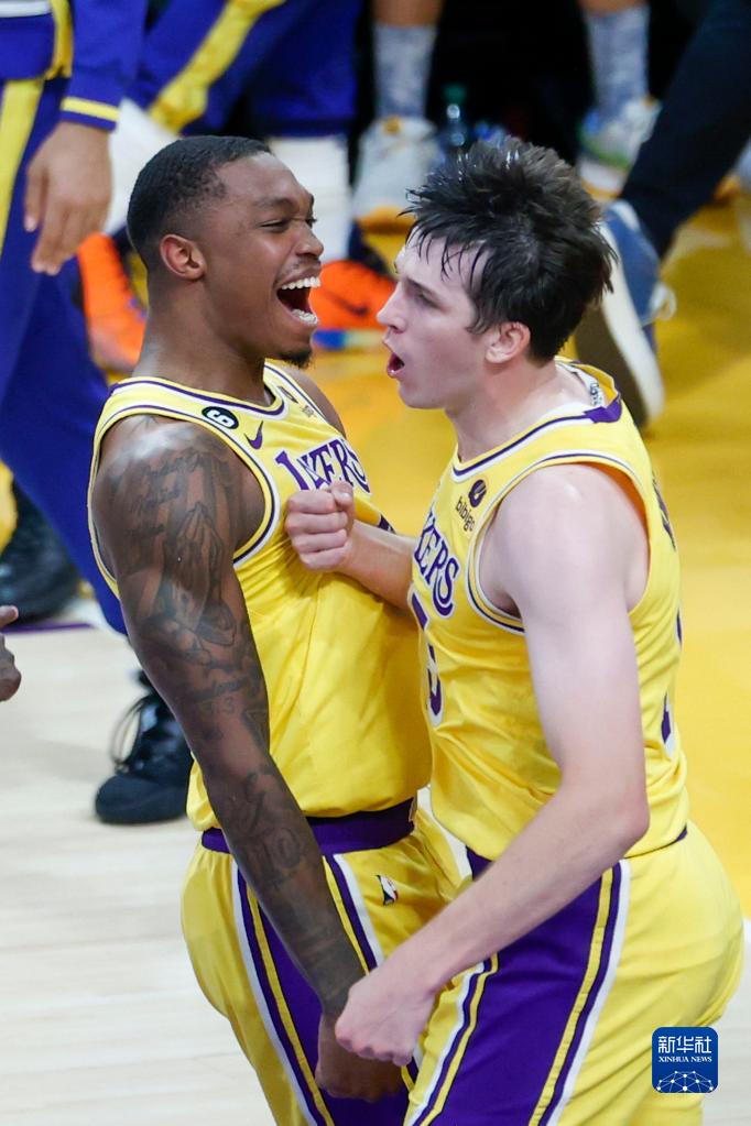 5月12日,湖人队球员奥斯汀·里维斯(右)与队友朗尼·沃克四世庆祝得分。新华社发(赵汉荣摄)