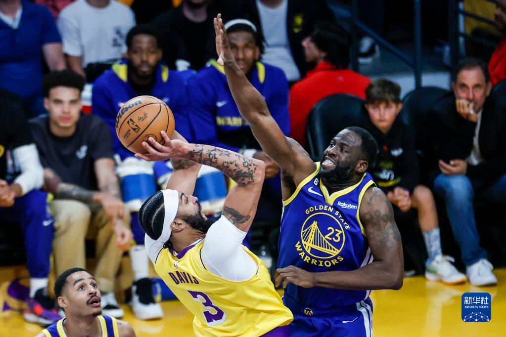 5月12日,湖人队球员安东尼·戴维斯(左)在勇士队球员德雷蒙德·格林防守下投篮。新华社发(赵汉荣摄)