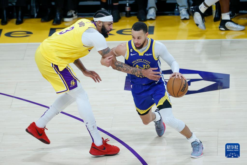 5月12日,湖人队球员安东尼·戴维斯(左)在比赛中防守勇士队球员斯蒂芬·库里。新华社发(赵汉荣摄)