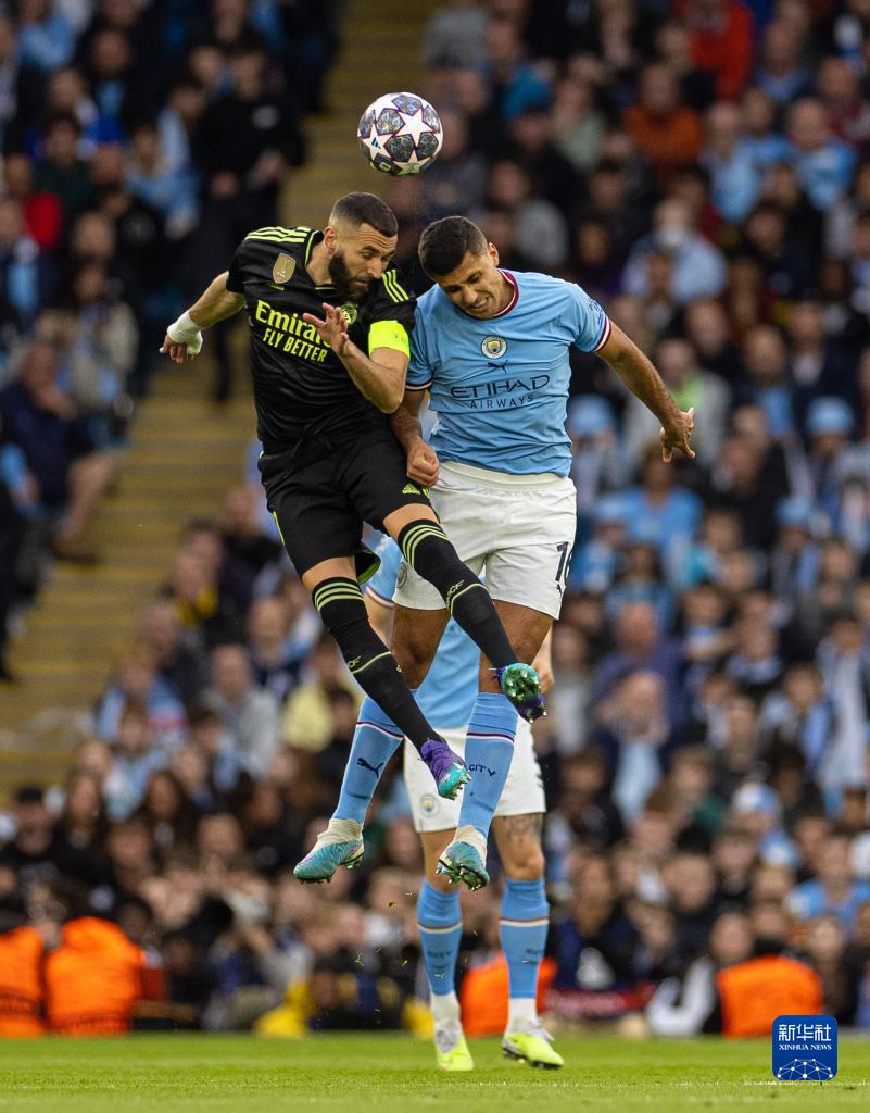 5月17日,曼彻斯特城队球员罗德里(右)与皇家马德里队球员本泽马在比赛中争顶。新华社发