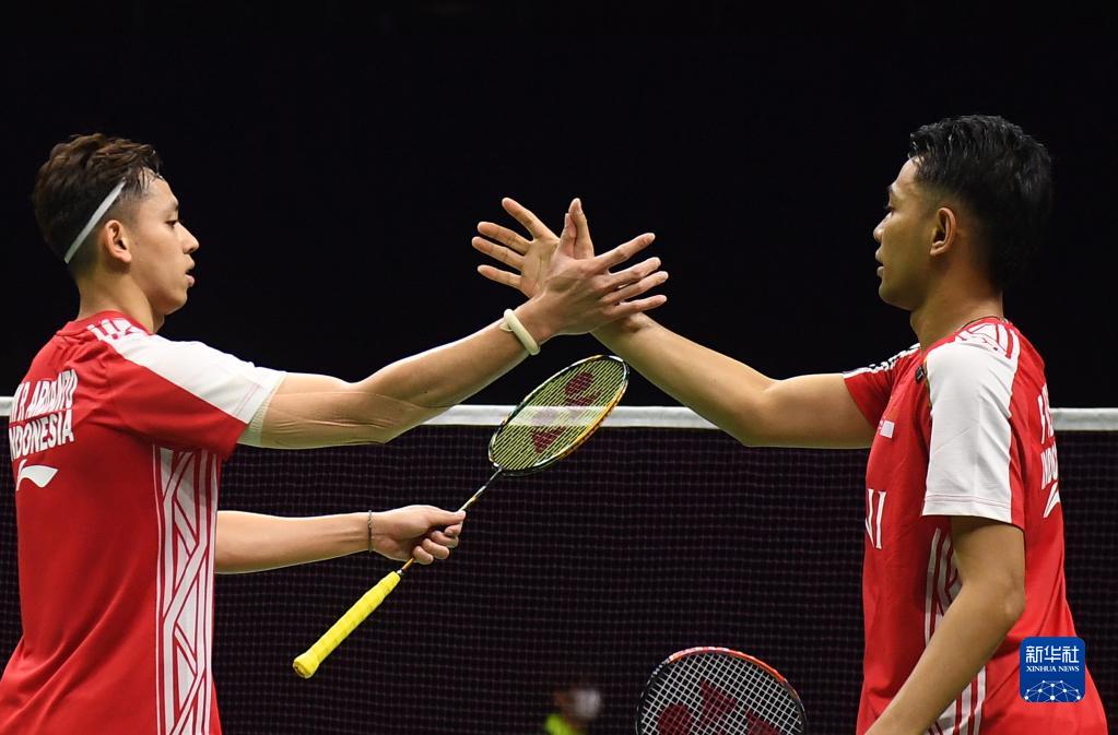 5月18日,印度尼西亚组合阿尔菲安(右)/阿迪安托在男双比赛中。他们以2比0战胜泰国组合苏柏克/吉丁努蓬。新华社记者 侯昭康 摄