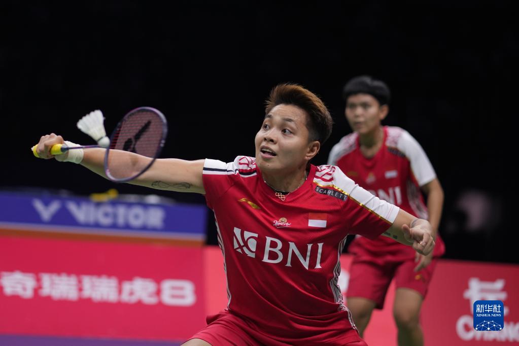 5月18日,印度尼西亚组合拉哈尤(前)/西蒂在女双比赛中,她们以2比1战胜泰国组合琼卡潘/拉温达。新华社记者 李博 摄