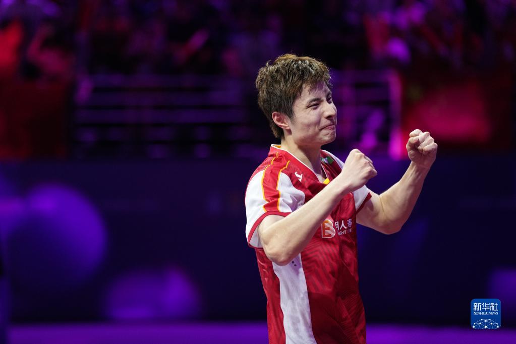 5月21日,中国队选手石宇奇(左)在男单比赛后庆祝获胜,他以2比0战胜韩国队选手李宥奎。