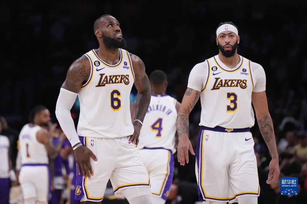 5月20日,湖人队球员勒布朗·詹姆斯(左)、安东尼·戴维斯在第四节比赛中。新华社/路透