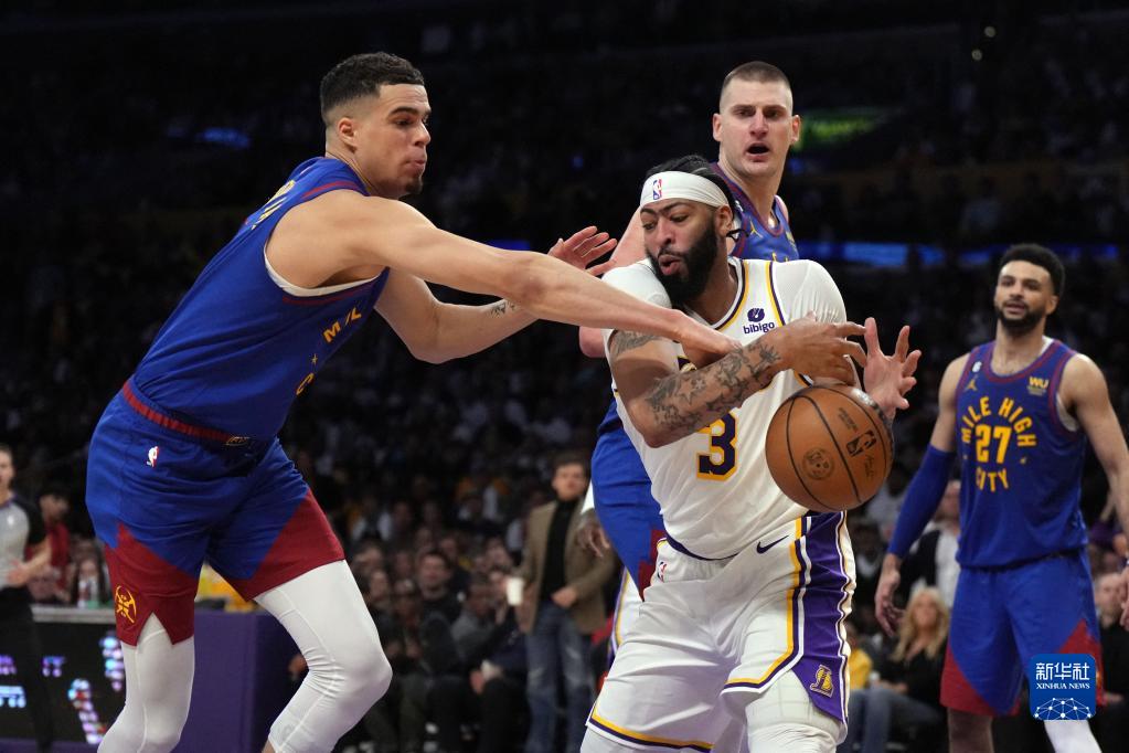 5月20日,掘金队球员迈克尔·波特(左)在比赛中防守湖人队球员安东尼·戴维斯。新华社/路透