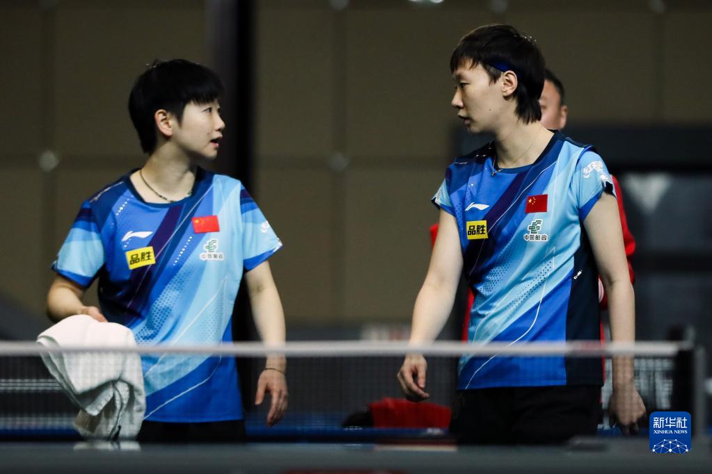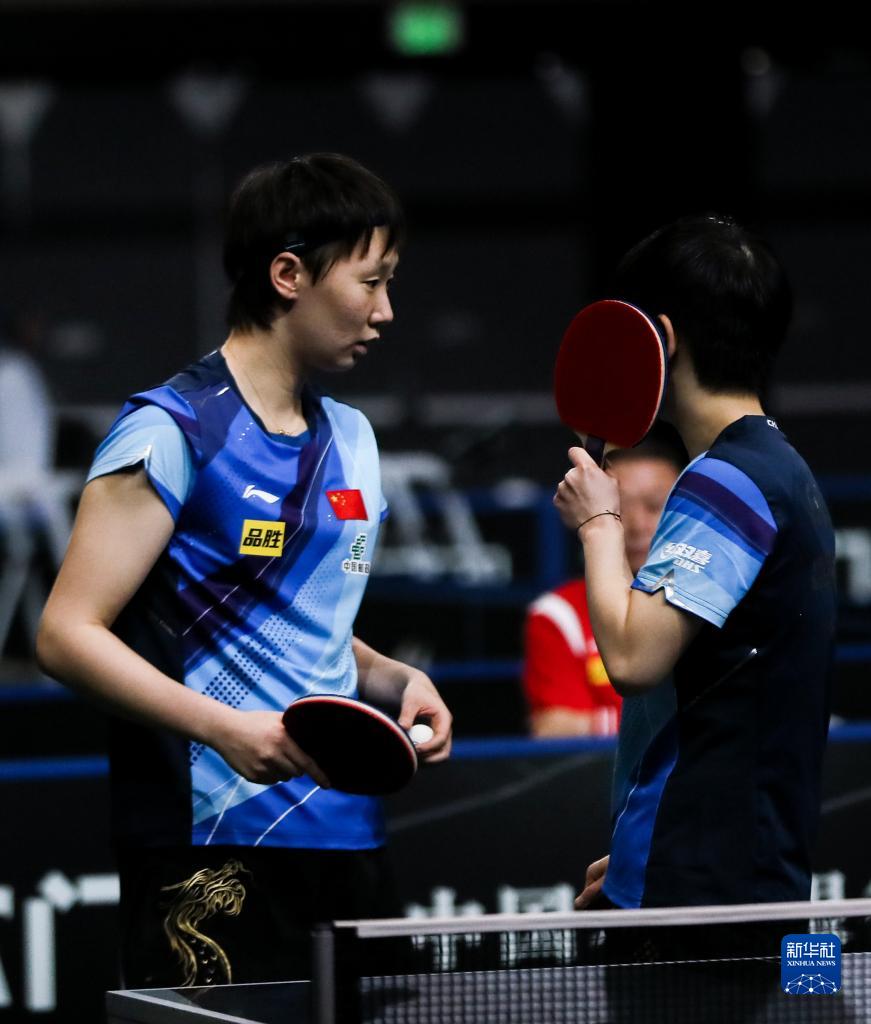 5月22日,孙颖莎/王曼昱(左)在比赛中交流。新华社记者 张誉东 摄