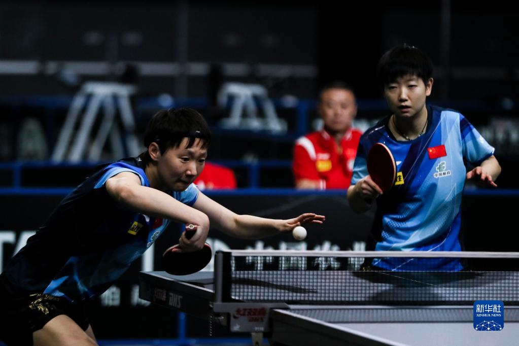 5月22日,孙颖莎/王曼昱(左)在比赛中回球。新华社记者 张誉东 摄