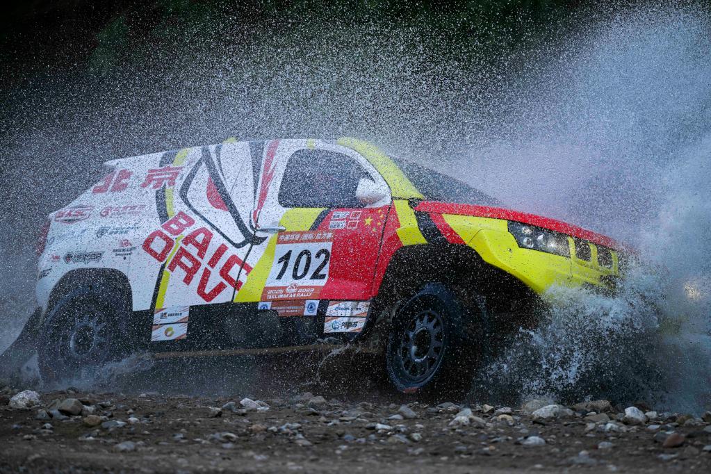 5月22日,北京汽车车队车手刘彦贵、领航员陈峰驾驶赛车冲出涉水路段。新华社记者胡虎虎摄