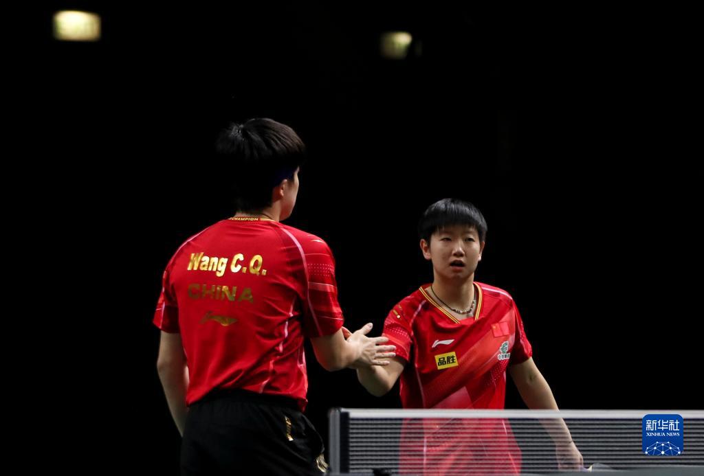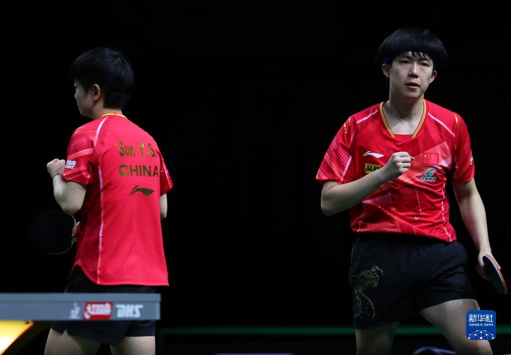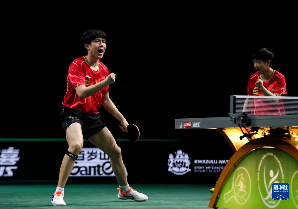 5月22日,王楚钦/孙颖莎(右)庆祝胜利。新华社记者 王东震 摄