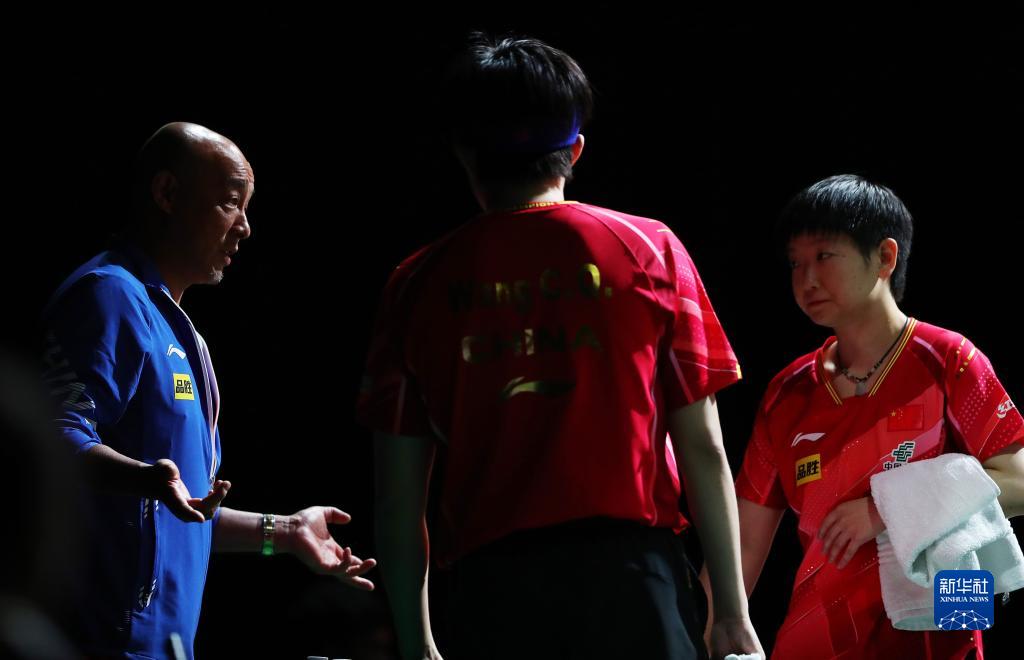 5月22日,教练肖战(左)在比赛中指导王楚钦(中)/孙颖莎。新华社记者 王东震 摄