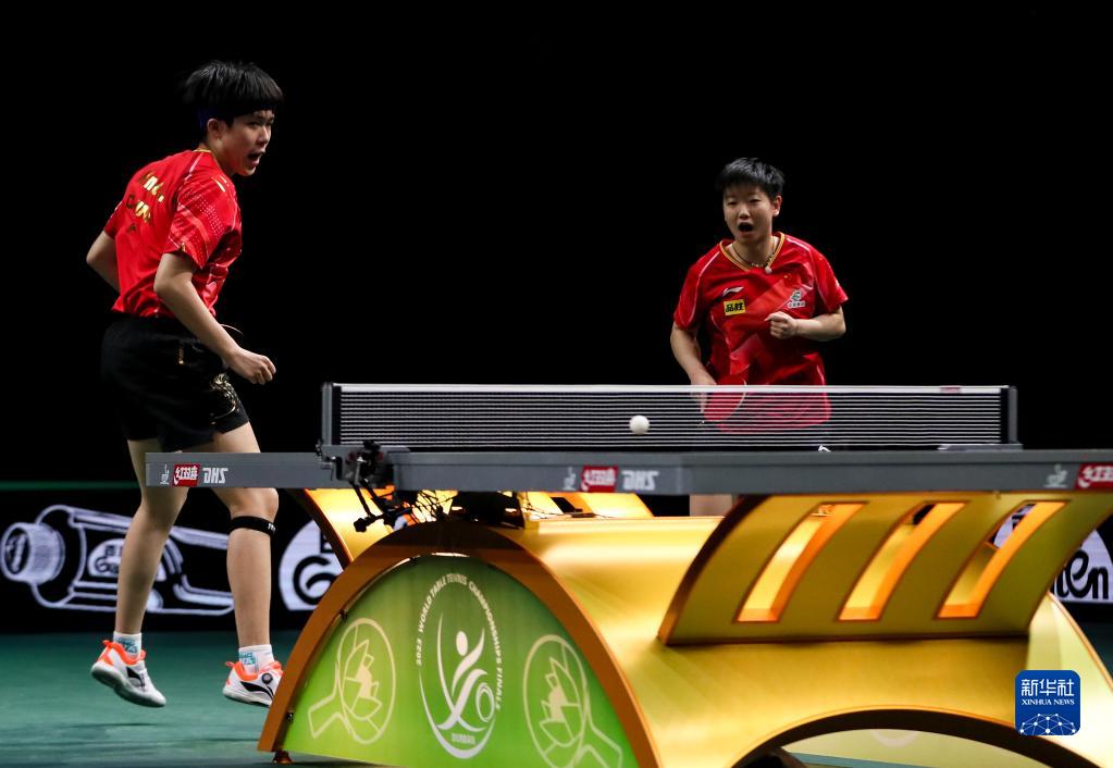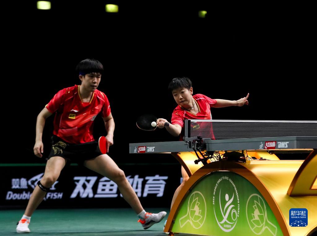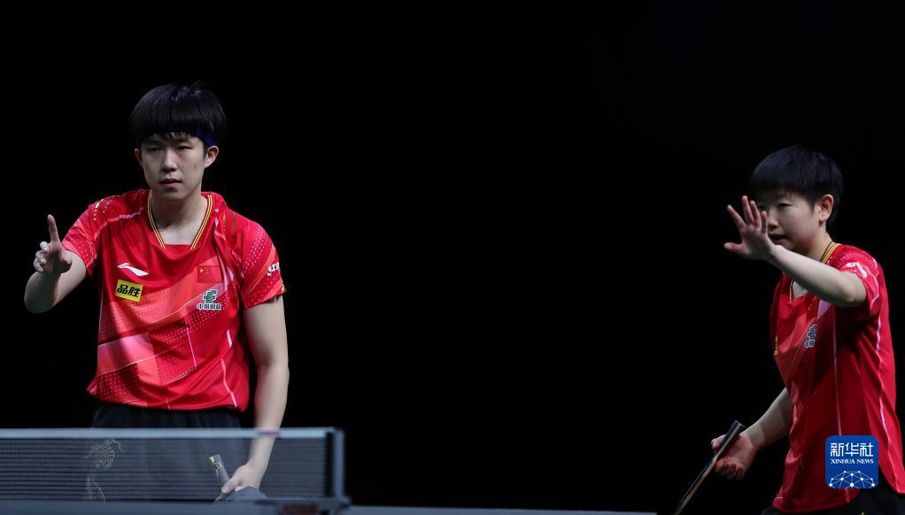 5月22日,王楚钦/孙颖莎(右)在比赛中。新华社记者 张誉东 摄