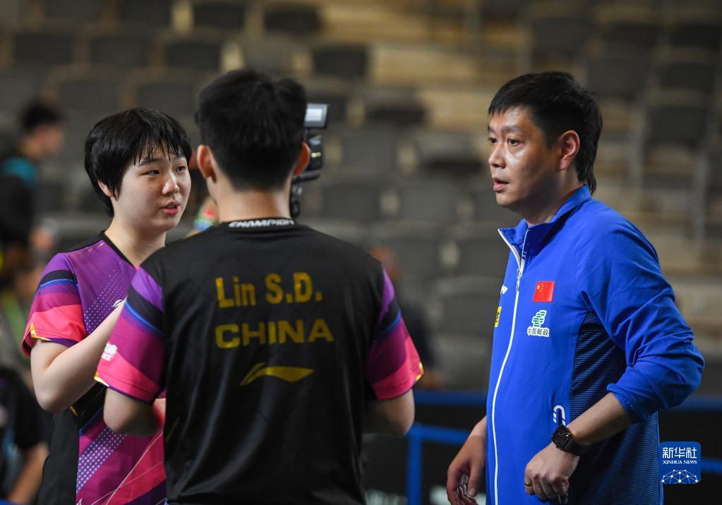 5月22日,林诗栋/蒯曼(左)在比赛间隙与教练邱贻可(右)交流。新华社记者 李亚辉 摄