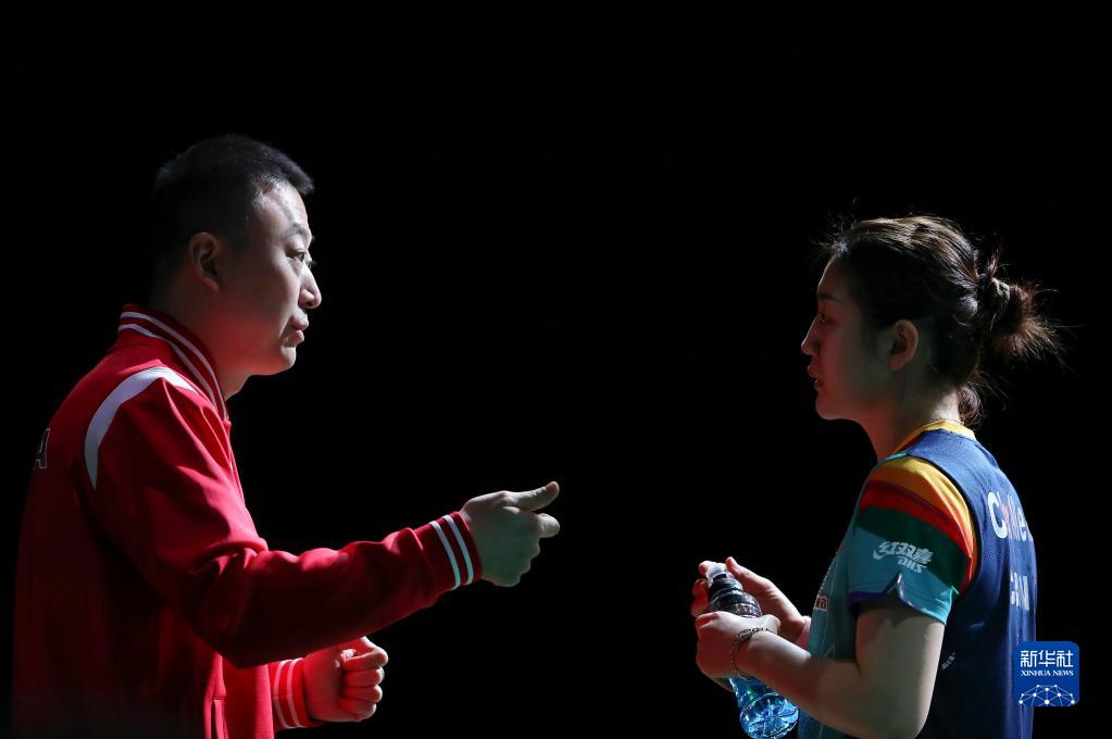 5月22日,陈梦(右)在比赛间隙接受教练马琳的指导。新华社记者 王东震 摄