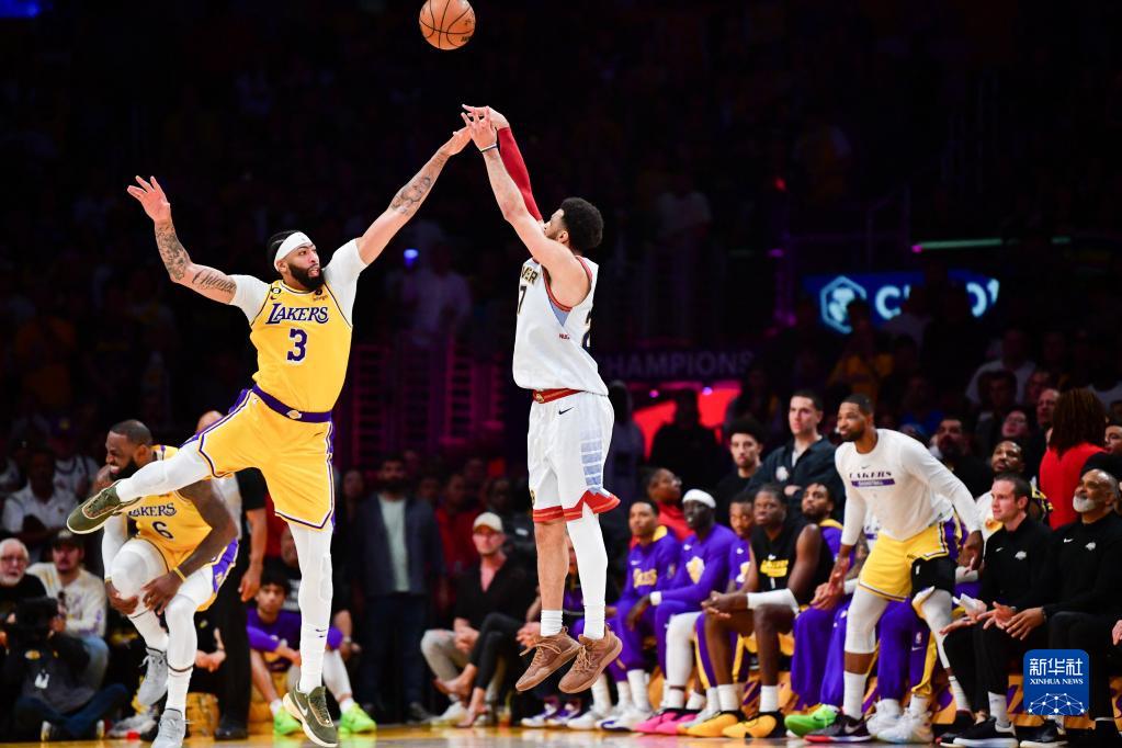 5月22日,丹佛掘金队球员贾马尔·穆雷(右)在洛杉矶湖人队球员安东尼·戴维斯的防守下投篮。新华社/路透
