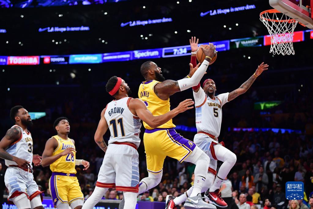 5月22日,丹佛掘金队球员阿隆·戈登(左四)、贾马尔·穆雷(左二)在比赛临近结束前防守洛杉矶湖人队球员勒布朗·詹姆斯(左三)。新华社/路透
