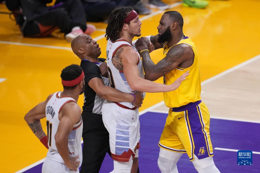 5月22日,洛杉矶湖人队球员勒布朗·詹姆斯(右一)与丹佛掘金队球员阿隆·戈登(右二)在比赛中发生争执。新华社/路透