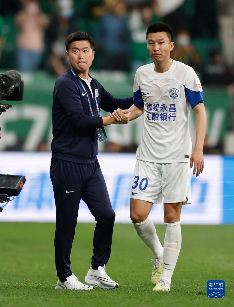 5月23日,沧州雄狮队主教练肇俊哲(左)在比赛后与球员刘洋握手致意。新华社记者 王丽莉 摄