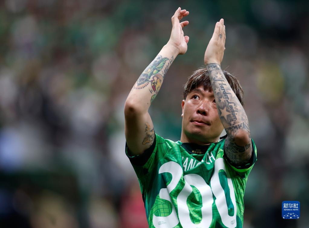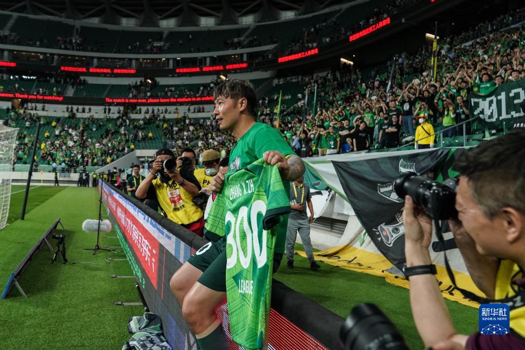 5月23日,北京国安队球员张稀哲身穿出战中超联赛300场的纪念球衣在赛后向球迷致意。新华社记者 王丽莉 摄