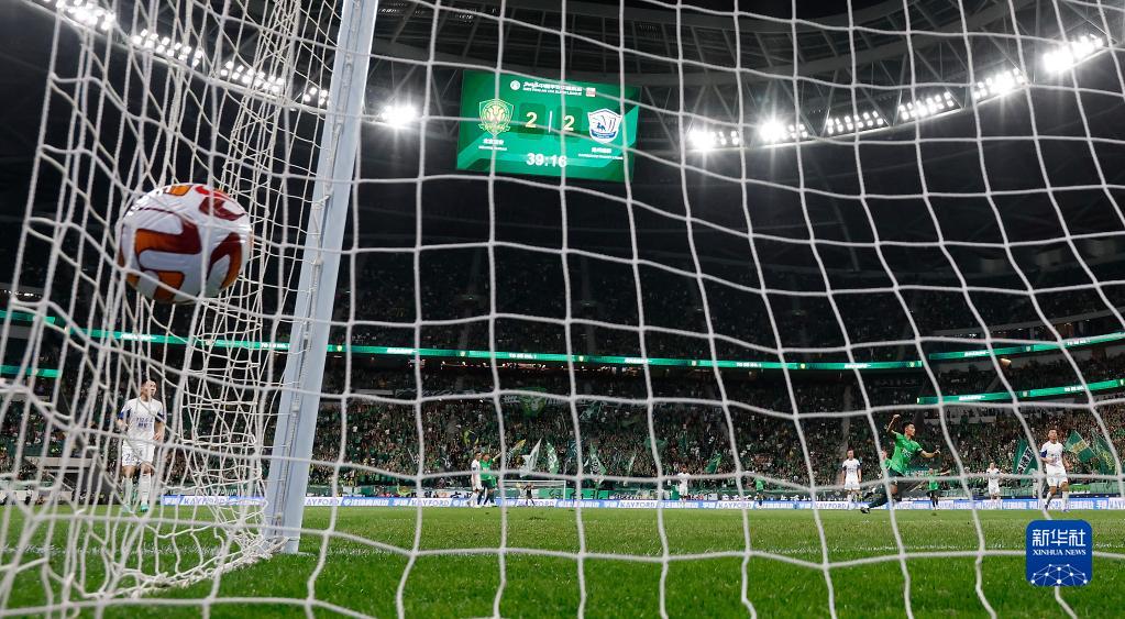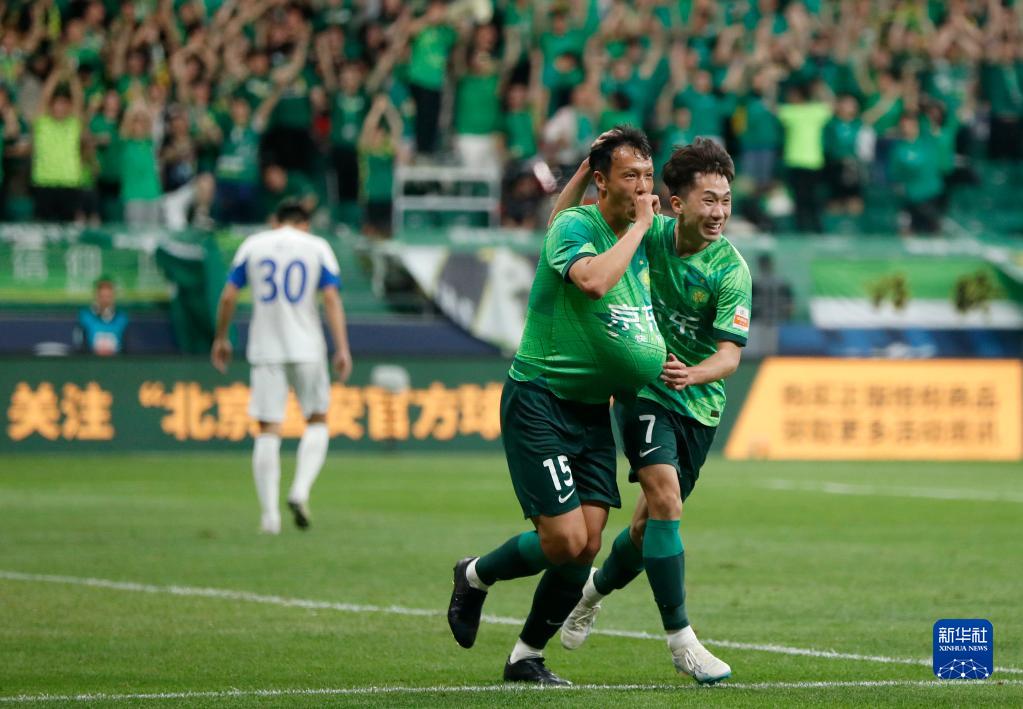 5月23日,北京国安队球员王子铭(上右二)在比赛中打入本场个人第二粒进球。新华社记者 贾浩成 摄