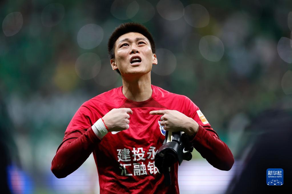 5月23日,北京国安队球员杨立瑜在比赛中进球后庆祝。新华社记者 贾浩成 摄
