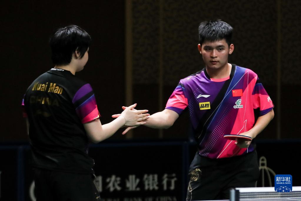 5月23日,林诗栋(右)/蒯曼在比赛获胜后击掌。新华社记者 张誉东 摄