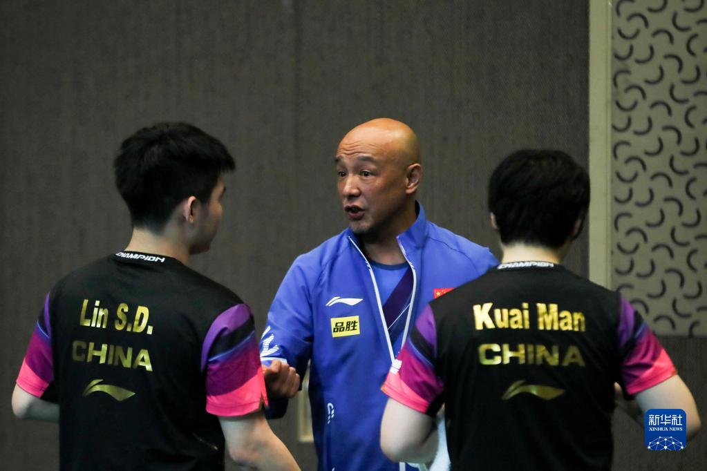 5月23日,教练肖战(中)在比赛间隙指导。新华社记者 张誉东 摄