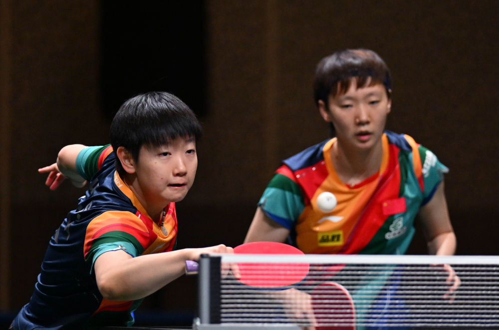 5月23日,王曼昱/孙颖莎(左)在比赛中回球。新华社记者 陶希夷 摄