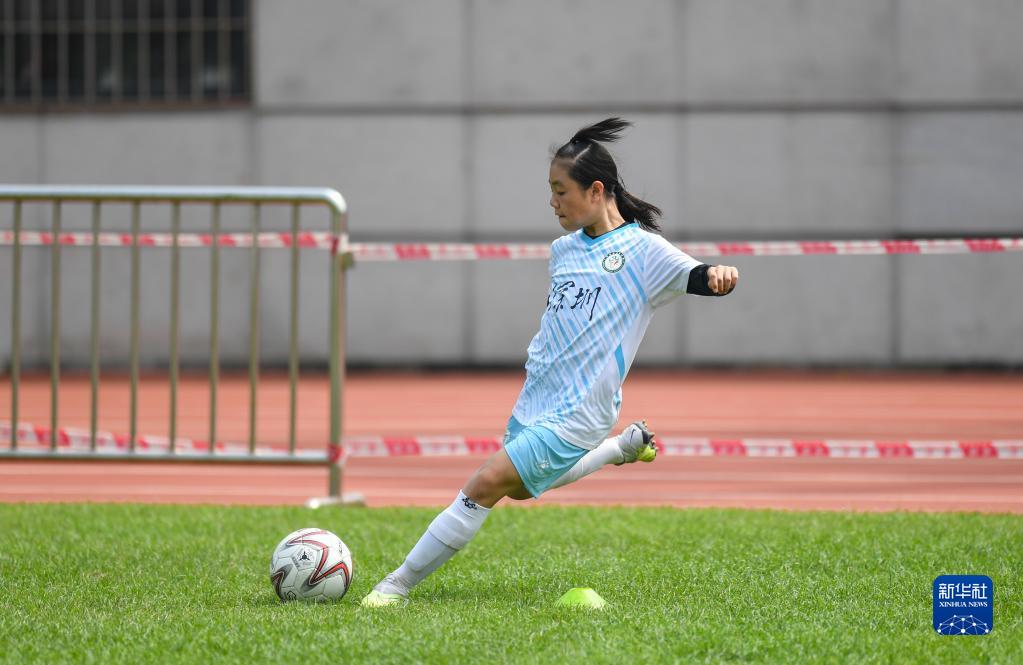 4月15日,练昱彤在深圳宝安体育场练习射门。新华社记者 毛思倩 摄