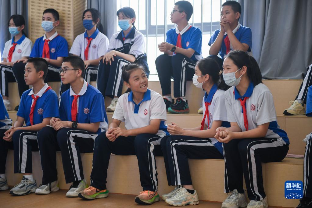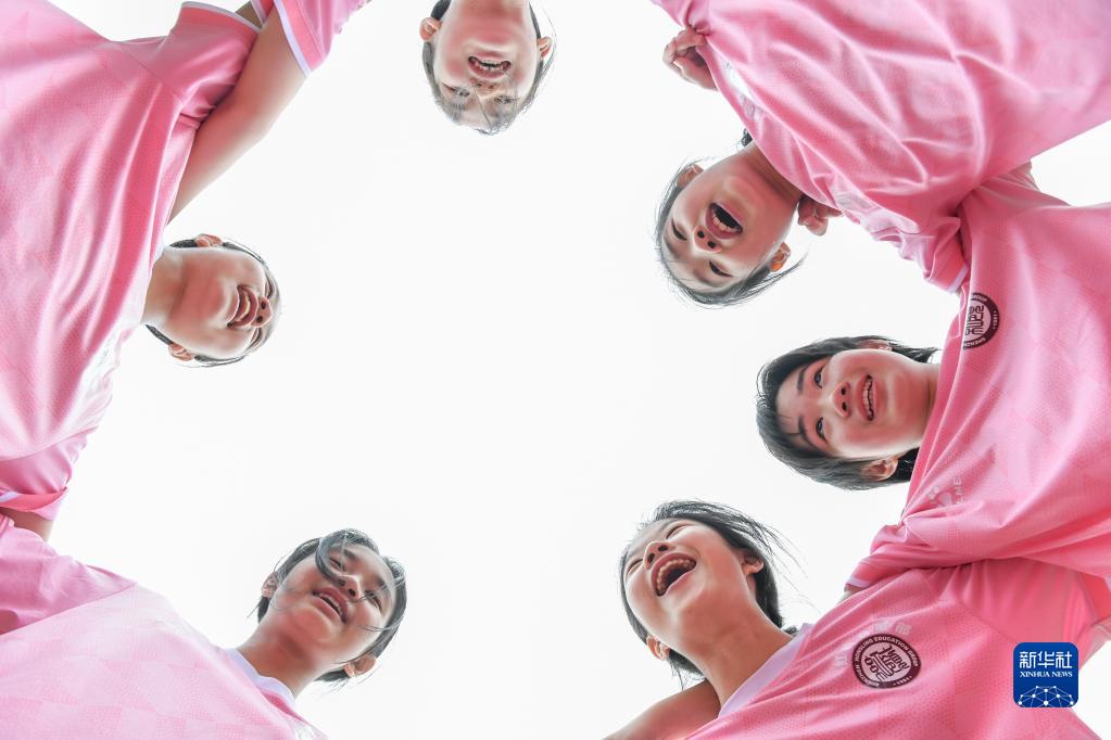 5月11日,练昱彤(左上)在深圳市红岭中学石厦初中部参加校队训练赛时和队友一起加油鼓劲。新华社记者 毛思倩 摄