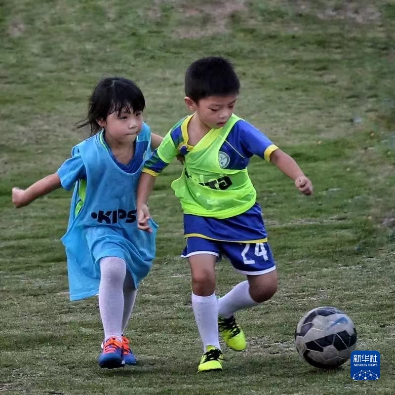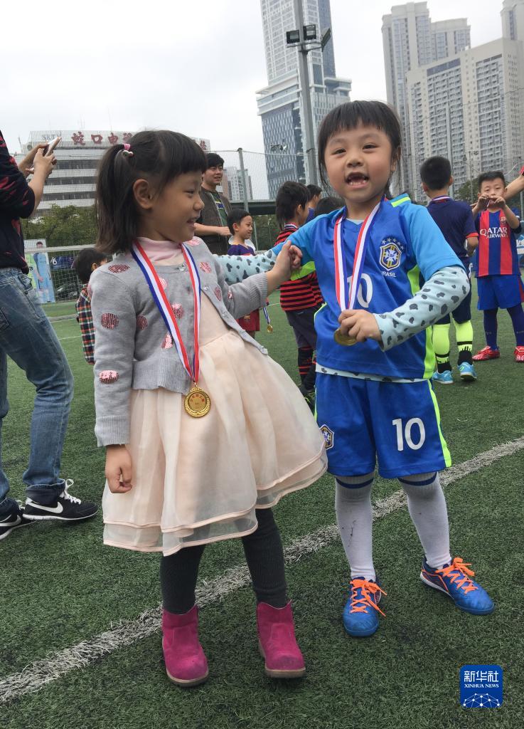 6岁的练昱彤(左)与一起训练的孩子练习踢球(2016年12月摄)。新华社发(受访者供图)