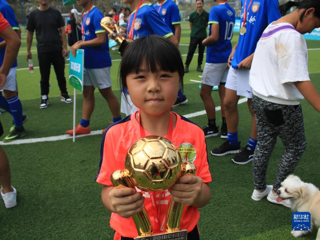 练昱彤在深圳参加福田杯足球赛时展示自己获得的奖杯(2018年10月27日摄)。新华社发(受访者供图)