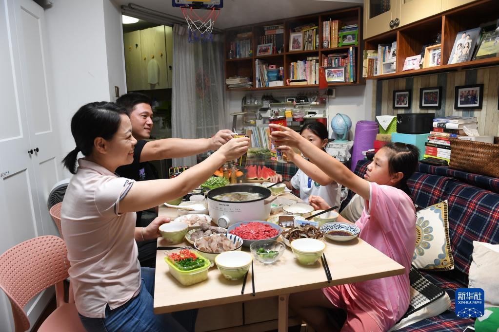 5月11日,因为小考成绩不错,父母在家中为练昱彤(右一)准备了一桌“大餐”,晚餐时一家人一起举杯庆祝。新华社记者 毛思倩 摄