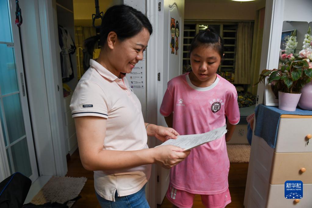5月11日,练昱彤(右)在家中把小考试卷给妈妈肖芬过目。新华社记者 毛思倩 摄