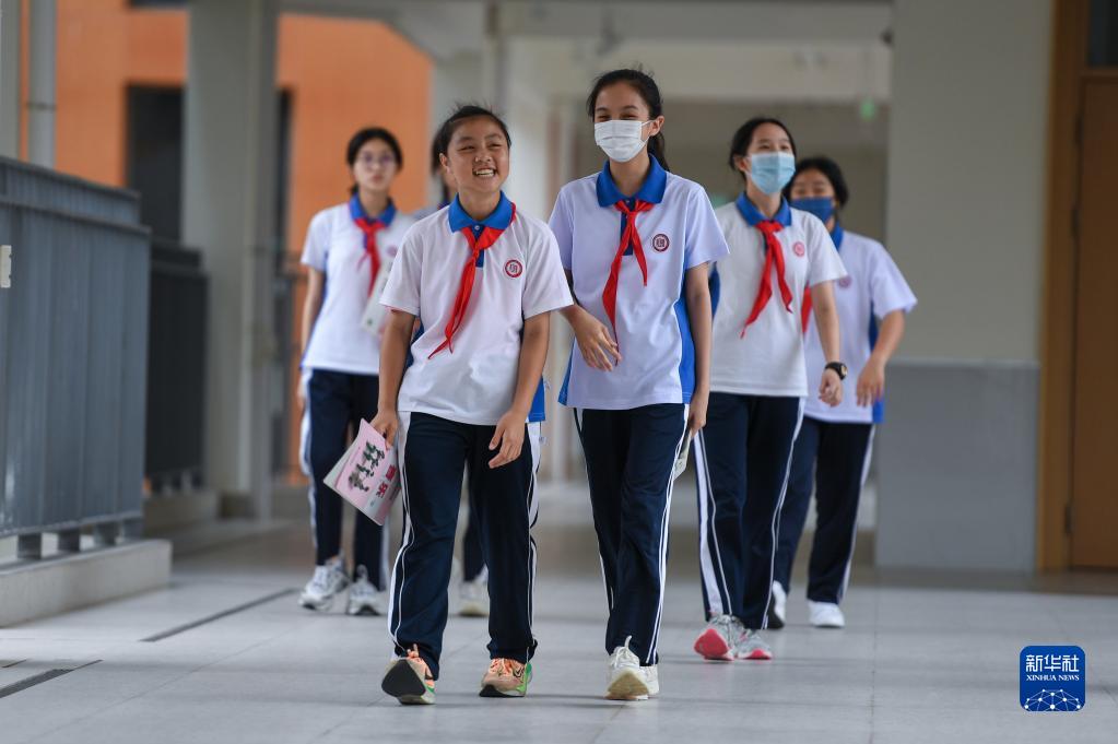 5月11日,练昱彤(前左)课间与同学走在深圳市红岭中学石厦初中部教学楼走廊上。新华社记者 毛思倩 摄