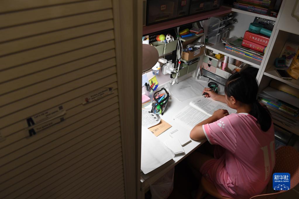 5月11日,练昱彤晚餐后在书桌前做作业。新华社记者 毛思倩 摄