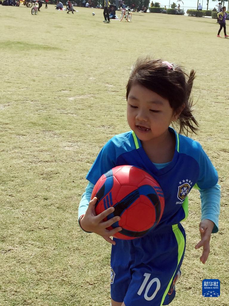 6岁的练昱彤在公园里体验足球(2016年12月11日摄)。新华社发(受访者供图)