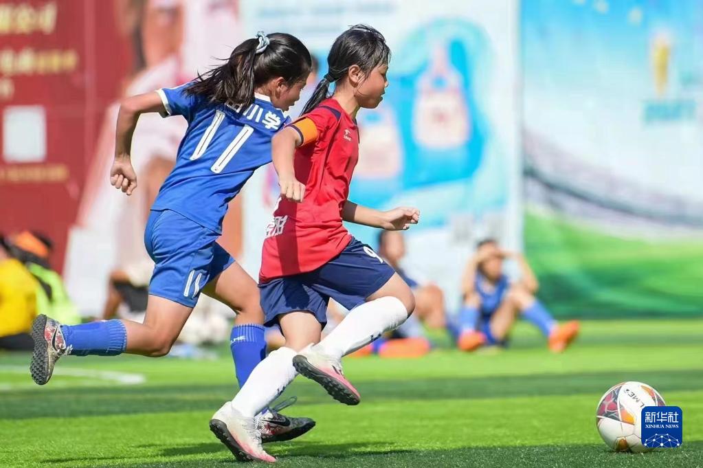 练昱彤(右)在深圳市中小学生校园足球比赛中拼抢(2021年11月摄)。新华社发(受访者供图)