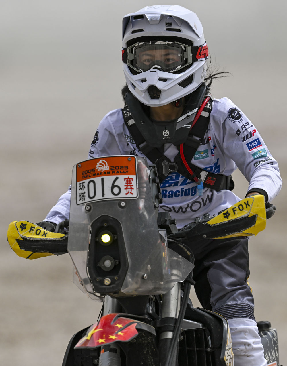 正在新疆进行的2023中国环塔(国际)拉力赛上,37名摩托车手参赛创历史新高,其中3名女骑手均为首次参赛。32岁的李艺斐就是女骑手之一。