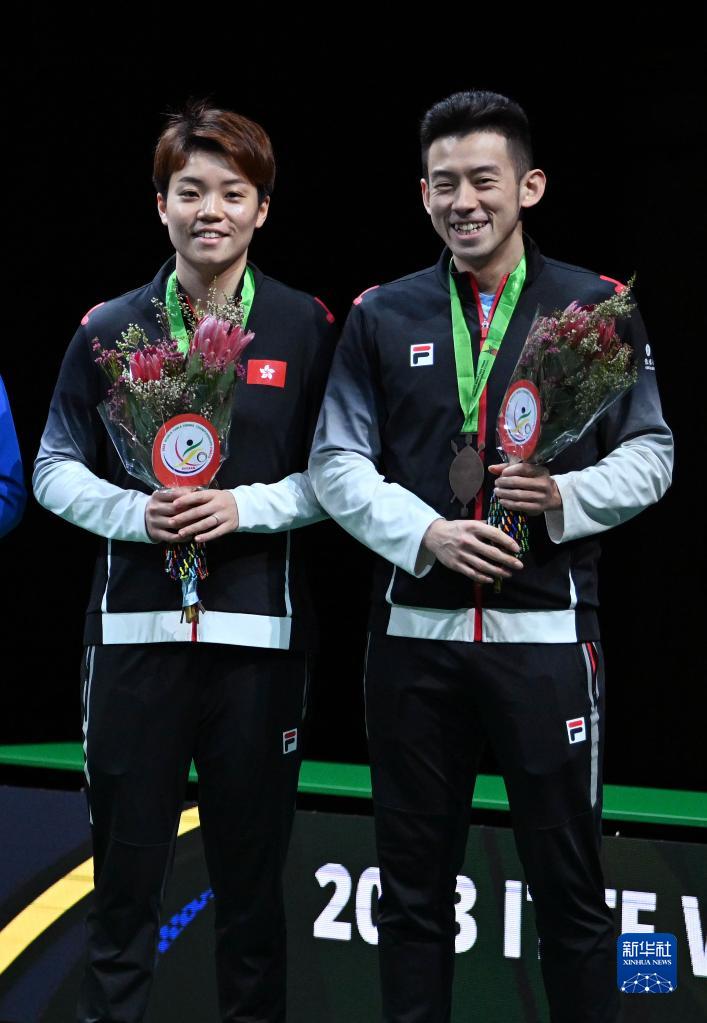 5月26日,季军中国香港选手黄镇廷(右)/杜凯琹在颁奖仪式上合影。新华社记者 陶希夷 摄
