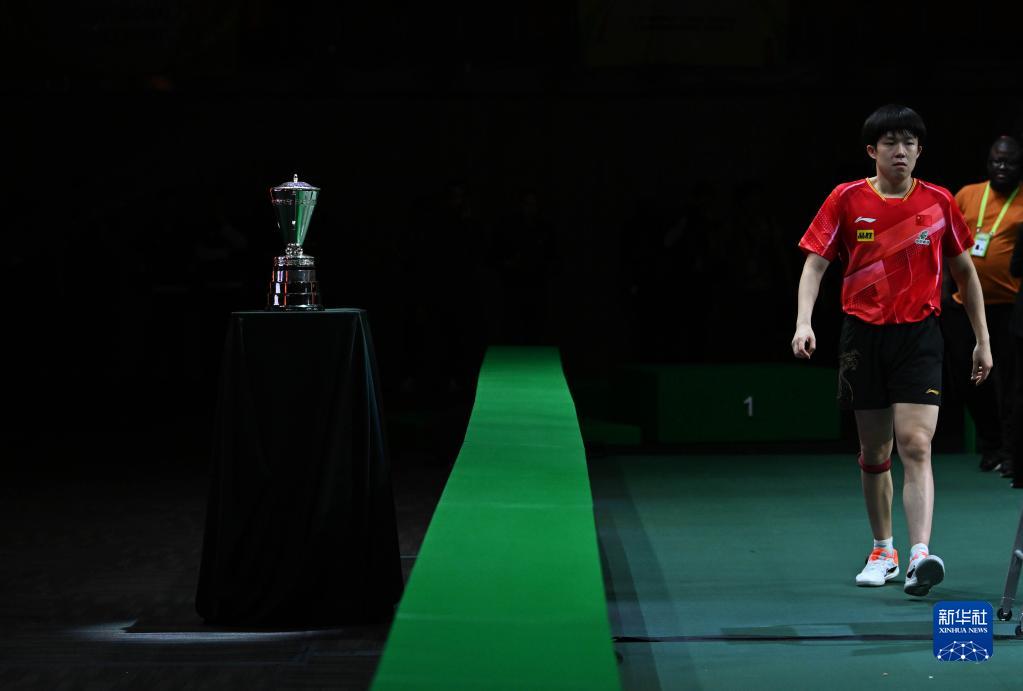 5月26日,王楚钦在接受赛后采访后,从混双冠军奖杯旁走过。新华社记者 陶希夷 摄