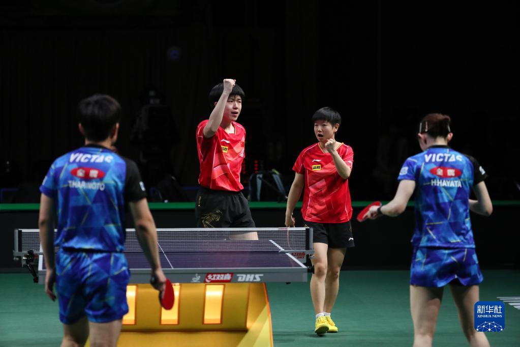 5月26日,王楚钦/孙颖莎(左)在比赛中庆祝。新华社记者 韩旭 摄