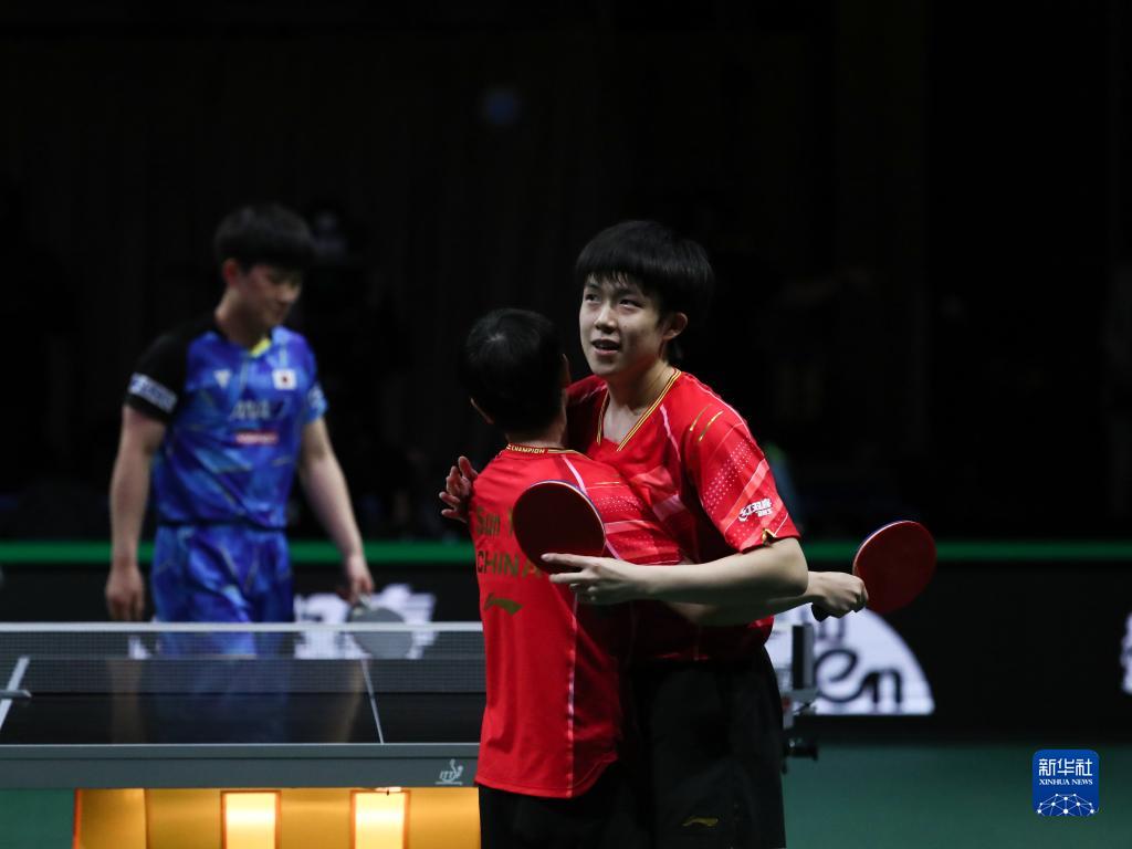 5月26日,王楚钦(右)/孙颖莎在获胜后拥抱。新华社记者 韩旭 摄