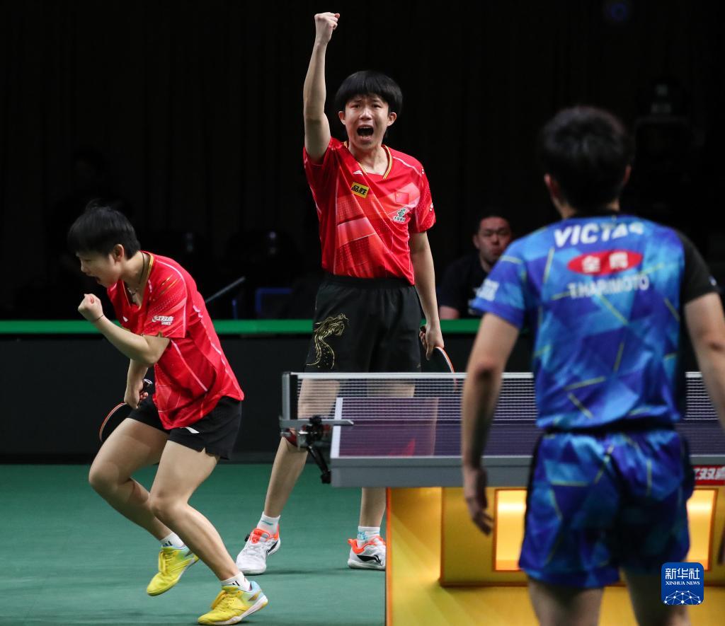 5月26日,王楚钦(左二)/孙颖莎(右二)在比赛中庆祝。新华社记者 韩旭 摄
