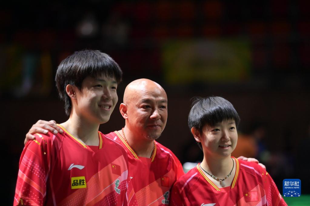5月26日,王楚钦(左)/孙颖莎(右)与教练肖战在赛后合影。新华社记者 韩旭 摄