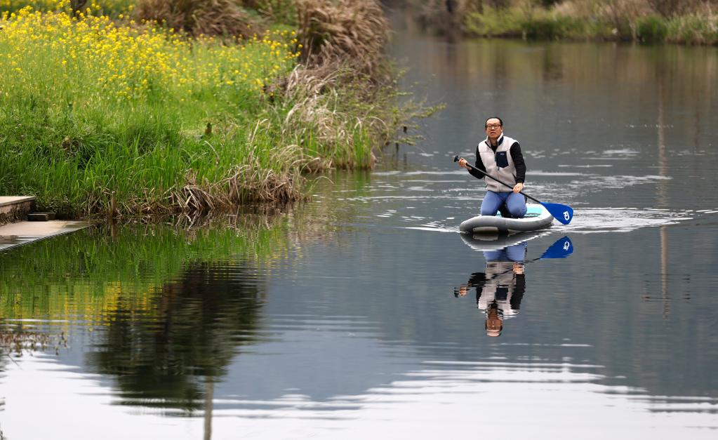 2023年3月29日,爱好者在民宿前的小河中划桨板。新华社记者张晨 摄