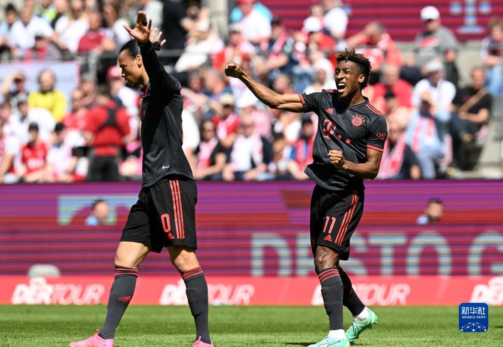 5月27日,拜仁慕尼黑队球员科曼(右)在比赛中进球后庆祝。新华社/法新