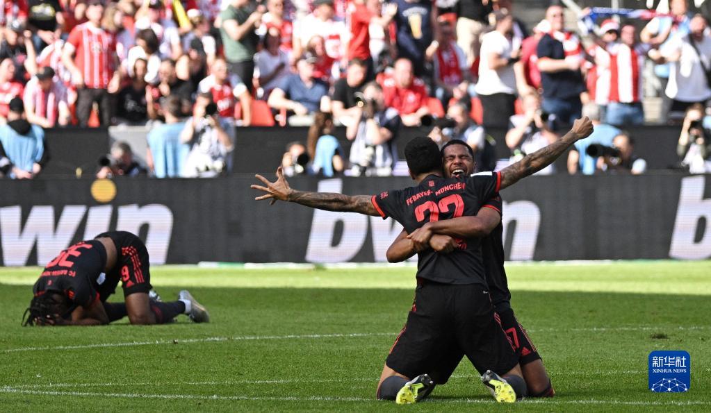 5月27日,拜仁慕尼黑队球员穆夏拉(左)在比赛中进球后庆祝。新华社/美联