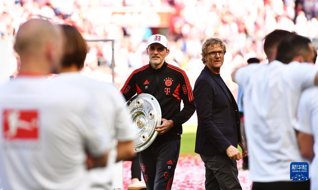 5月27日,拜仁慕尼黑队主教练图赫尔(左三)在比赛后庆祝。新华社/美联